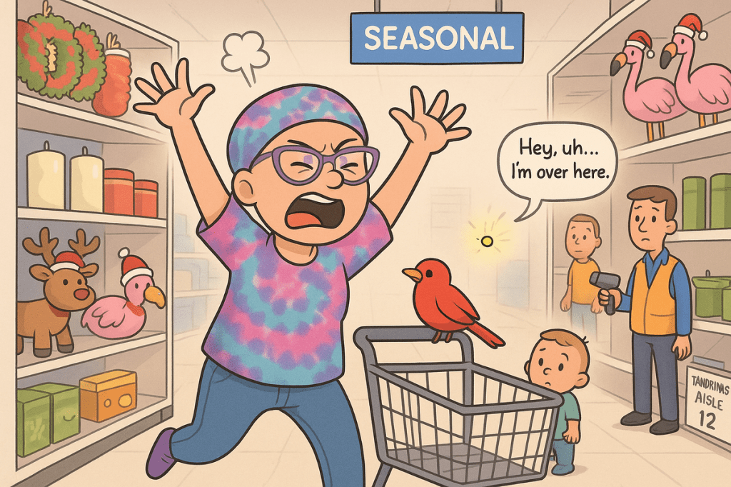 As the store lights got brighter and the music louder, I realized I’d entered that fuzzy zone where everything blends together—people, hangers, sparkly sweaters, the smell of perfume from twenty feet away. Basically, I became Sassy the Wonder Dog at TJ Maxx—overstimulated and wandering the aisles like I might discover enlightenment behind the clearance rack.