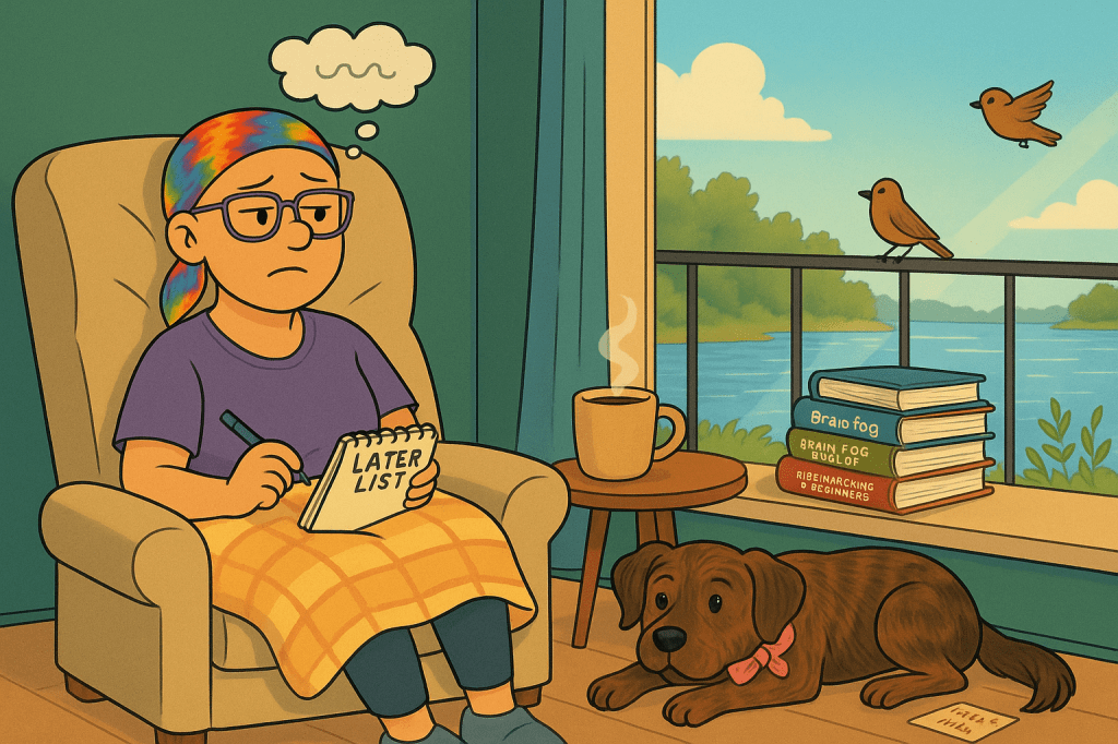 That one was Friday. Today — finally — is the first morning I woke up without the chemo fog. You know the one — that fuzzy-brained nonsense where you wake up asking, Where am I? What day is it? And why does everything taste like pennies and regret?